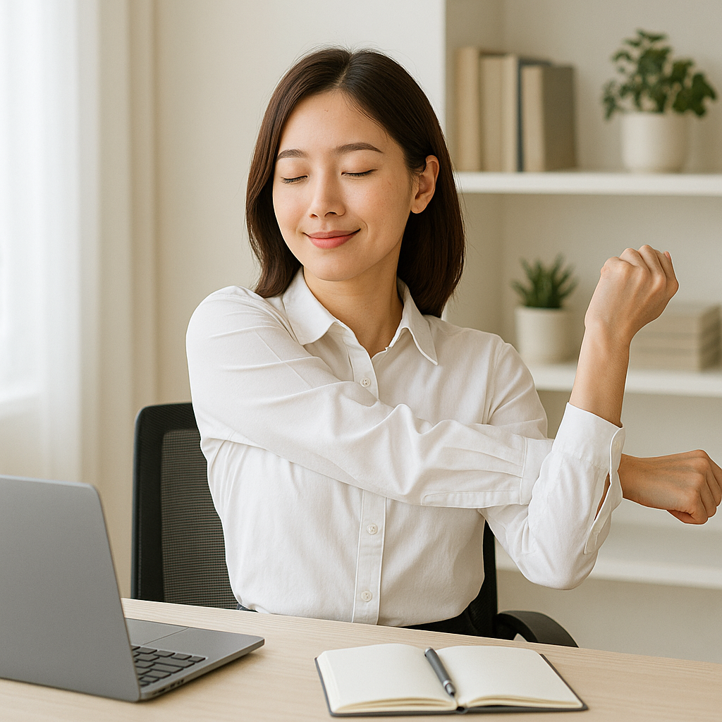 업무 중 틈틈이 가능한 간단한 자세 교정 동작은 거북목과 굽은 어깨를 예방합니다.
